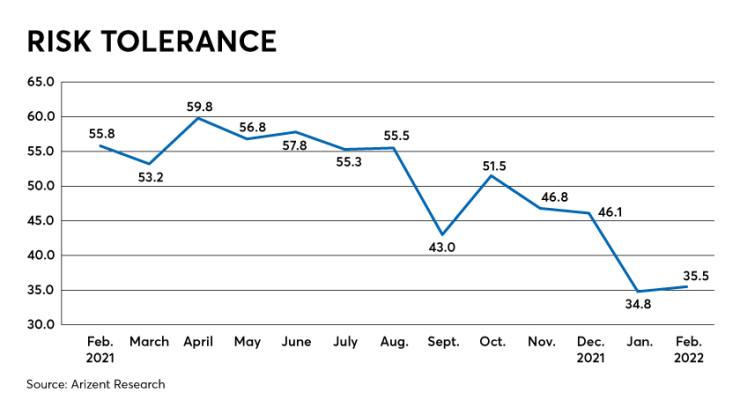 Risk tolerance remains a significant factor for clients mulling their retirement plans these days. The element of RACI that tracks clients' appetite for risk posted a dismal 35.5 in February, which, while a modest 0.8 point increase from January, was off 20.3 points from the year-earlier period, and represented the second-lowest score in the category since April 2020.