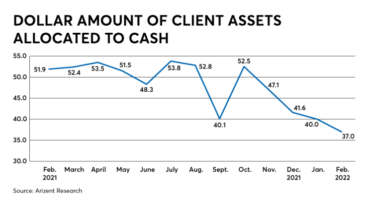 The unit of RACI that tracks cash allocations dipped to 37, the lowest mark since December 2018. That amounted to a month-over-month decline of three points and was down nearly 15 points from the same period a year ago.