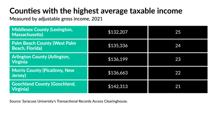 All data is from Syracuse University's Transactional Records Access Clearinghouse and is based on federal income tax returns filed in 2021. All dollar figures refer to