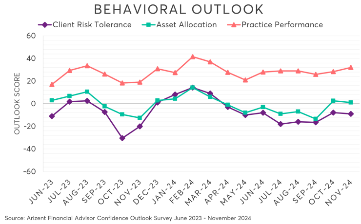 Whatever their concerns, overall wealth managers said their businesses were doing well. FACO's score for practice performance increased this month, rising from 28 in October to 32 in November.