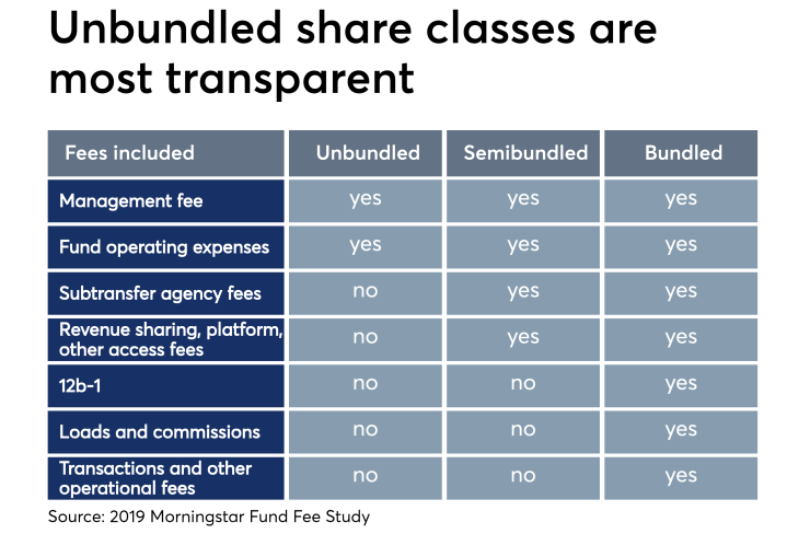Share classes that don’t charge 12b-1 fees, but do charge for revenue sharing, have reported inflows, according to Morningstar. They gained $183 billion in assets in 2018 and $581 billion the year before.