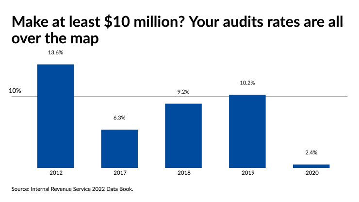 Changes in audit rates for those making $500,000 but less than $1 million have also swung over the years but haven't had the steep drop-off seen for $10 million-plus earners.