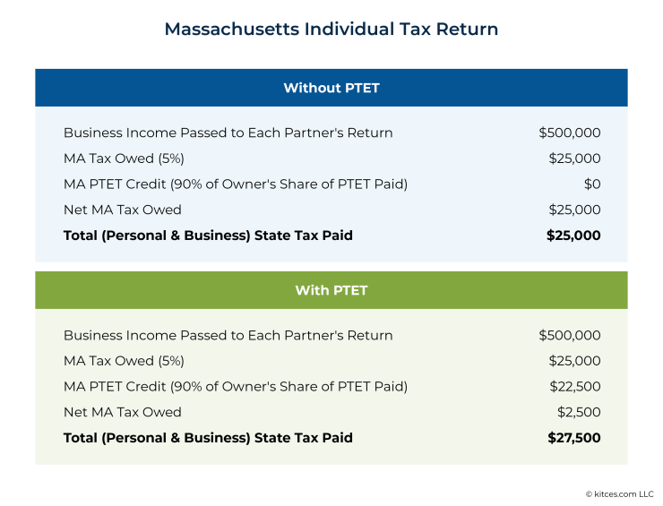 In effect, then, the mechanics of PTETs are much more complicated than simply shifting state tax payments from being a personal expense (deductible only up to the $10,000 SALT deduction limit) to a (fully-deductible) business expense for federal tax purposes. Different states have different nuances (such as Massachusetts' allowing a credit for only up to 90% of the PTET paid) that affect the value of electing any given state's PTET.