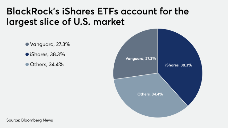 BlackRock’s annual U.S. ETF flows were greater than Vanguard’s from 2014 through 2019, according to Bloomberg data. It still reigns in assets, with iShares accounting for about 38% of the U.S. ETF market, compared with 27% for Vanguard’s offerings.