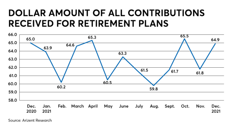 On the other hand, many advisors reported a strong close to the year as measured by retirement products sold and overall contributions. The RACI component that tracks dollar contributions to retirement plans posted a score of 64.9, up 3.1 points from November, and very likely a product of the typical surge at the end of the calendar year.