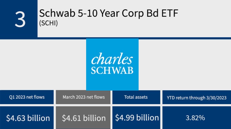 To see the U.S. bond ETFs that garnered the most new dollars, net of withdrawals, in the first three months of 2023, scroll down the slideshow. All data is from Morningstar Direct and includes year-to-date returns and fund sizes. Numbers are rounded. Slides are in ascending order.