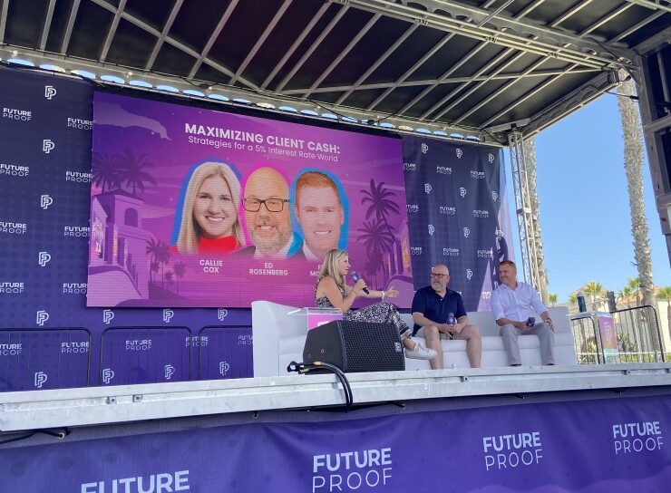 The panel "Maximizing Client Cash: Strategies for a 5% Interest Rate World" was a part of the Future Proof Festival this week in Huntington, Beach California. The session was moderated by Callie Cox, chief market strategist at Ritholtz Wealth Management. It featured Ed Rosenberg, managing director and head of ETF and funds management at Texas Capital, and Frank McKiernan, senior vice president and senior private wealth advisor at Procyon Partners.