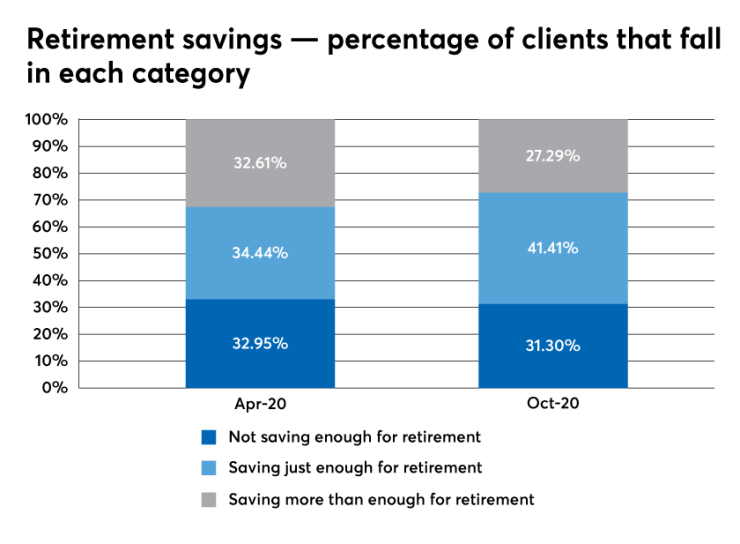 However, the number of clients saving more than enough for retirement fell off a few percentage points over the same span, according to the survey.