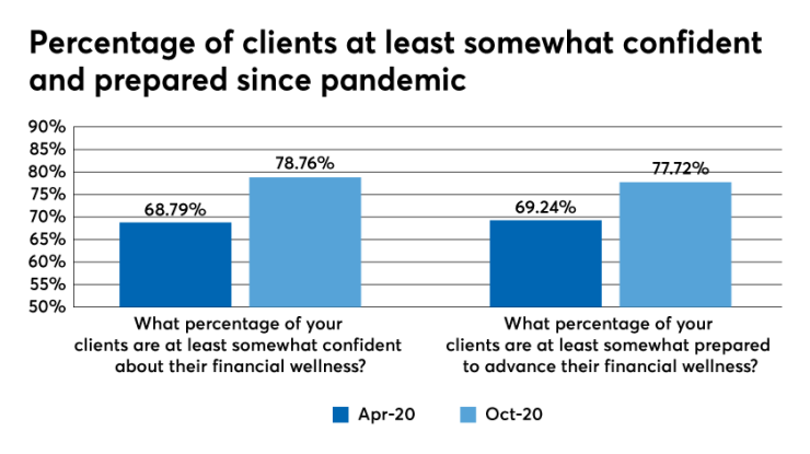 But while clients were generally feeling better about their financial situation in October than they did in April, that doesn’t mean they’ve returned to the pre-pandemic levels of confidence, according to Financial Planning's latest Financial Wellness Report.