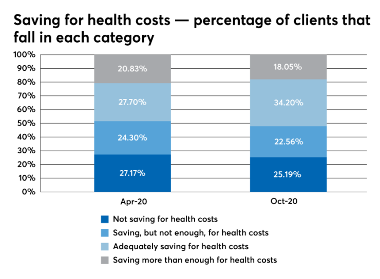 Regarding health care, advisors say that the number of clients who are adequately saving for health costs has risen from 27.7% in April to 34.2% in October, while the number of clients either not saving at all for health costs or not saving enough has ticked down slightly over the same period.
