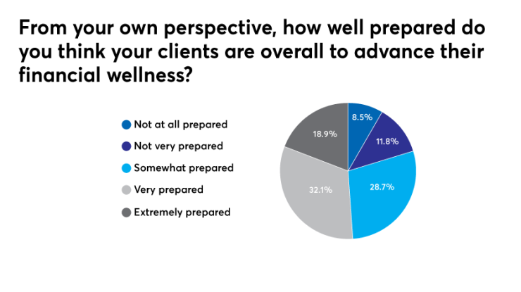When polled about their own assessments, 79.7% of advisors say they believed their clients were somewhat, very or extremely prepared to advance their financial wellness.