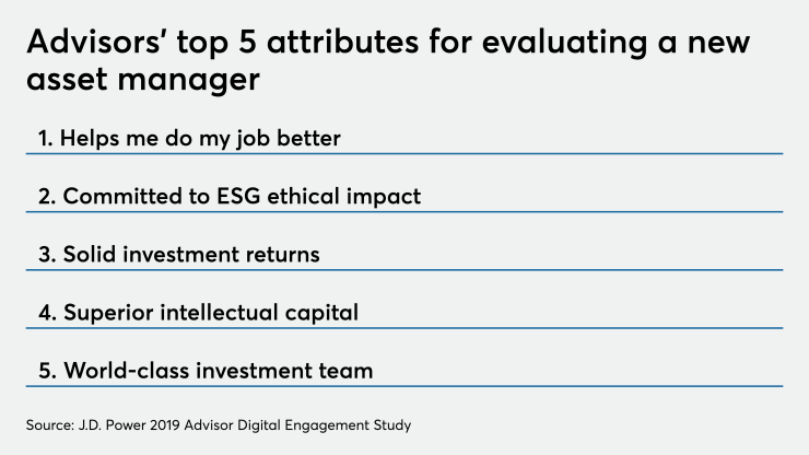 When evaluating a new asset manager, commitment to ESG is the second-most important consideration for financial advisors, right behind whether the money manager helps advisors do their job better, according to J.D. Power.