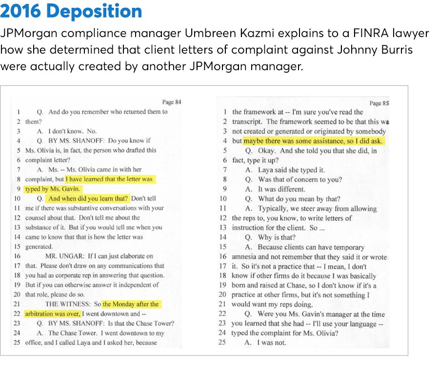 The purpose of her testimony was to address Burris’ claims that he was wrongfully terminated and then defamed in retaliation for refusing to invest more of his clients’ savings in the bank's high-priced, in-house funds and managed accounts. The hearing, like many private arbitrations, favored the employer over the employee: Burris wasn't allowed to call some JPMorgan witnesses he wanted his lawyer to question, and the bank — with the approval of FINRA, the arbitration’s overseer — refused many of his discovery requests. Much of the discovery he did receive was redacted.