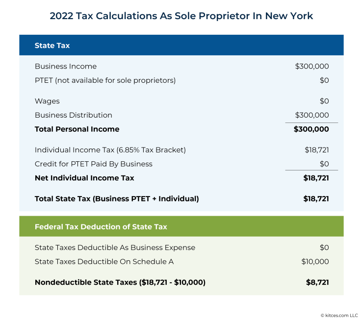 As a sole proprietor, Marge is ineligible to elect into New York's PTET. Based on her income, as shown below, she would pay $18,721 in New York individual income tax, of which only $10,000 would be deductible as an itemized deduction on Schedule A for Federal tax purposes (because of the SALT deduction cap, assuming there are no other state or local tax payments that would reduce that amount further). This would leave Marge with $8,721 in nondeductible state taxes.
