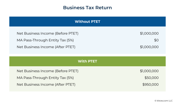 In effect, then, the mechanics of PTETs are much more complicated than simply shifting state tax payments from being a personal expense (deductible only up to the $10,000 SALT deduction limit) to a (fully-deductible) business expense for federal tax purposes. Different states have different nuances (such as Massachusetts' allowing a credit for only up to 90% of the PTET paid) that affect the value of electing any given state's PTET.