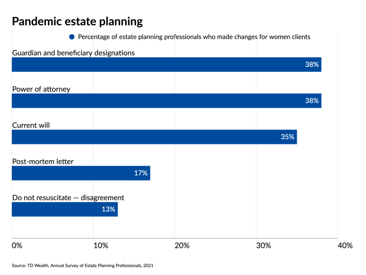 The study adds to the growing body of data on how sharply the pandemic has set working women back financially. TD Wealth, part of Toronto-based TD Bank, commissioned its poll of 142 certified estate planners, estate planning attorneys, trust officers, charitable giving professionals, insurance advisors, elder law specialists, wealth management professionals and non-profit advisors about pandemic-related changes their women clients were making.