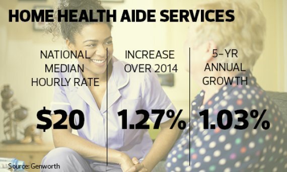 Though the price tag is going up across the board, the costs for in-home care options are growing at a slower pace -- welcome relief to the many individuals who would prefer stay in their homes as they age. The costs of private rooms in nursing homes saw the steepest increase -- more than 4% growth from 2014 -- while the median hourly rate for in-home health aides saw the smallest increase, up just over 1% since last year.
