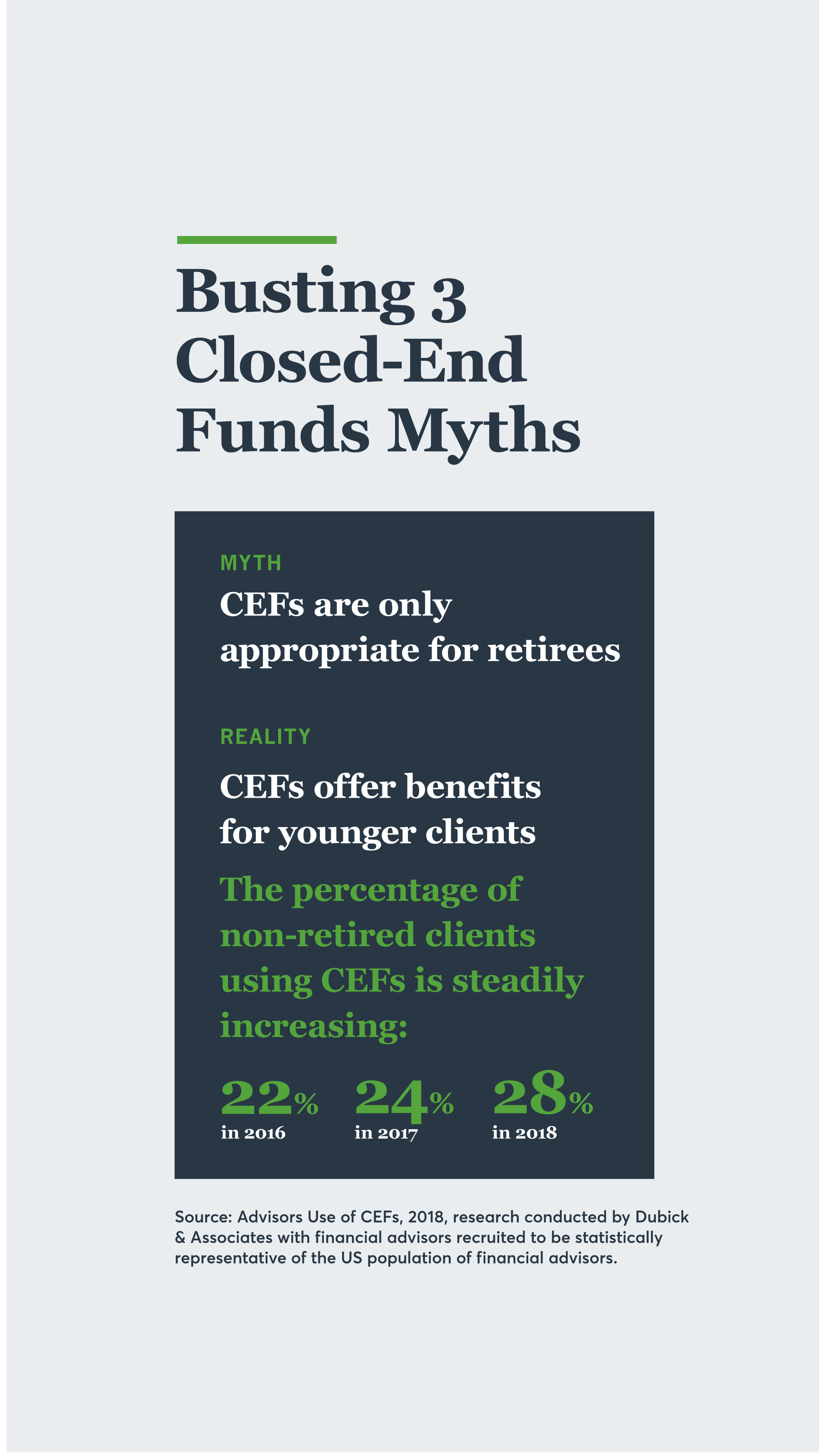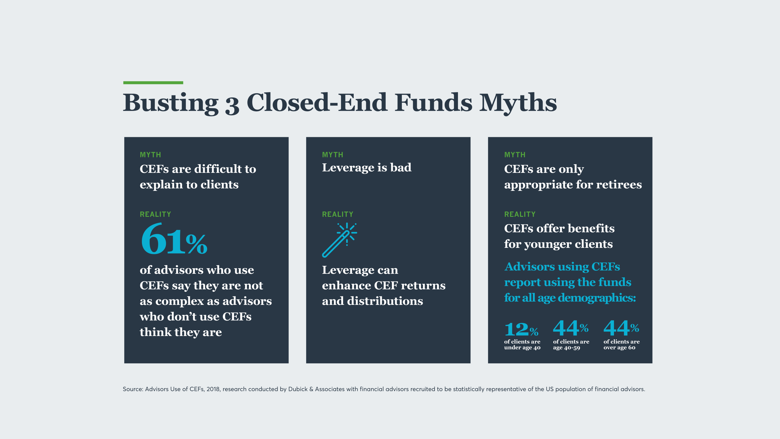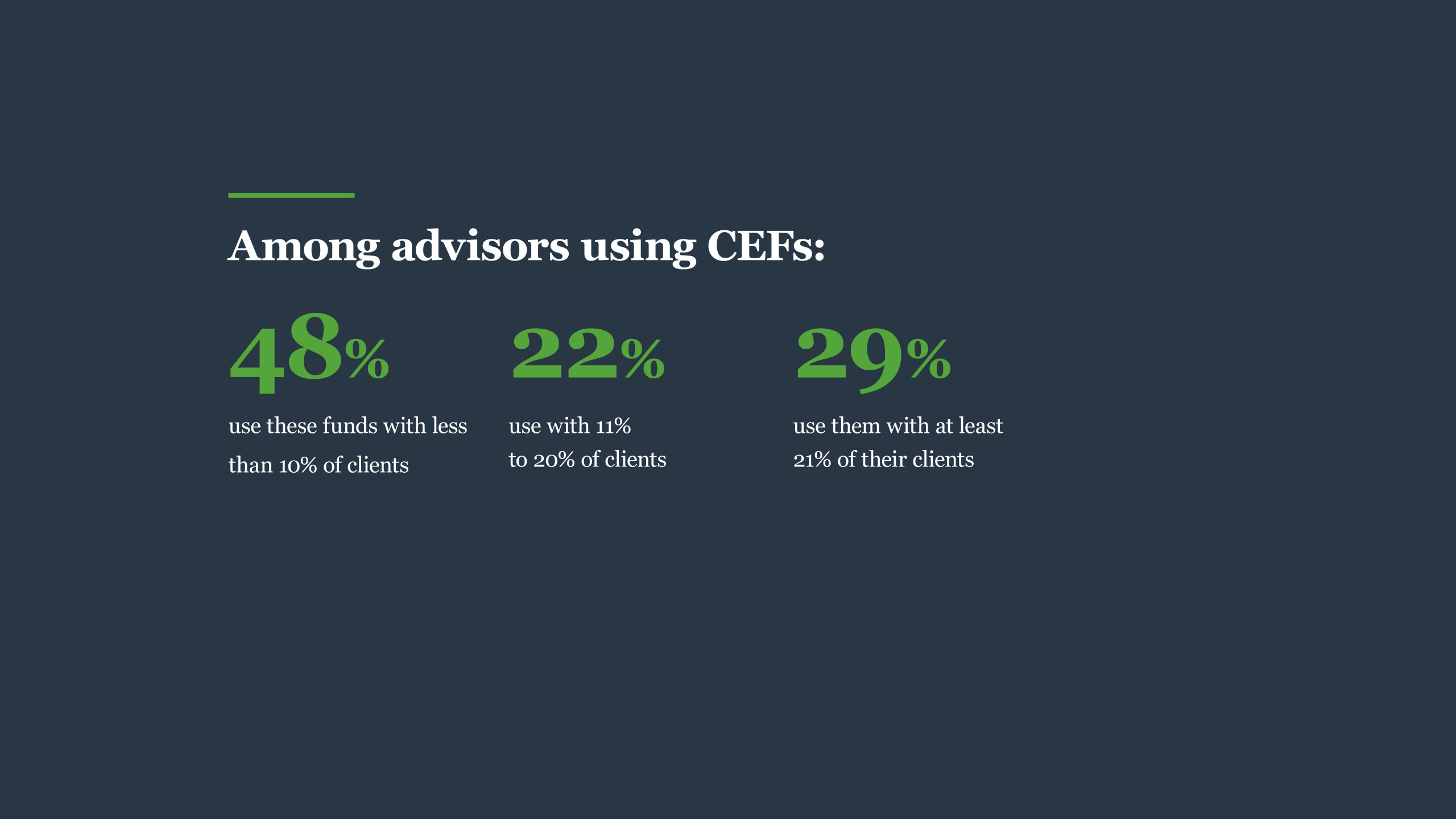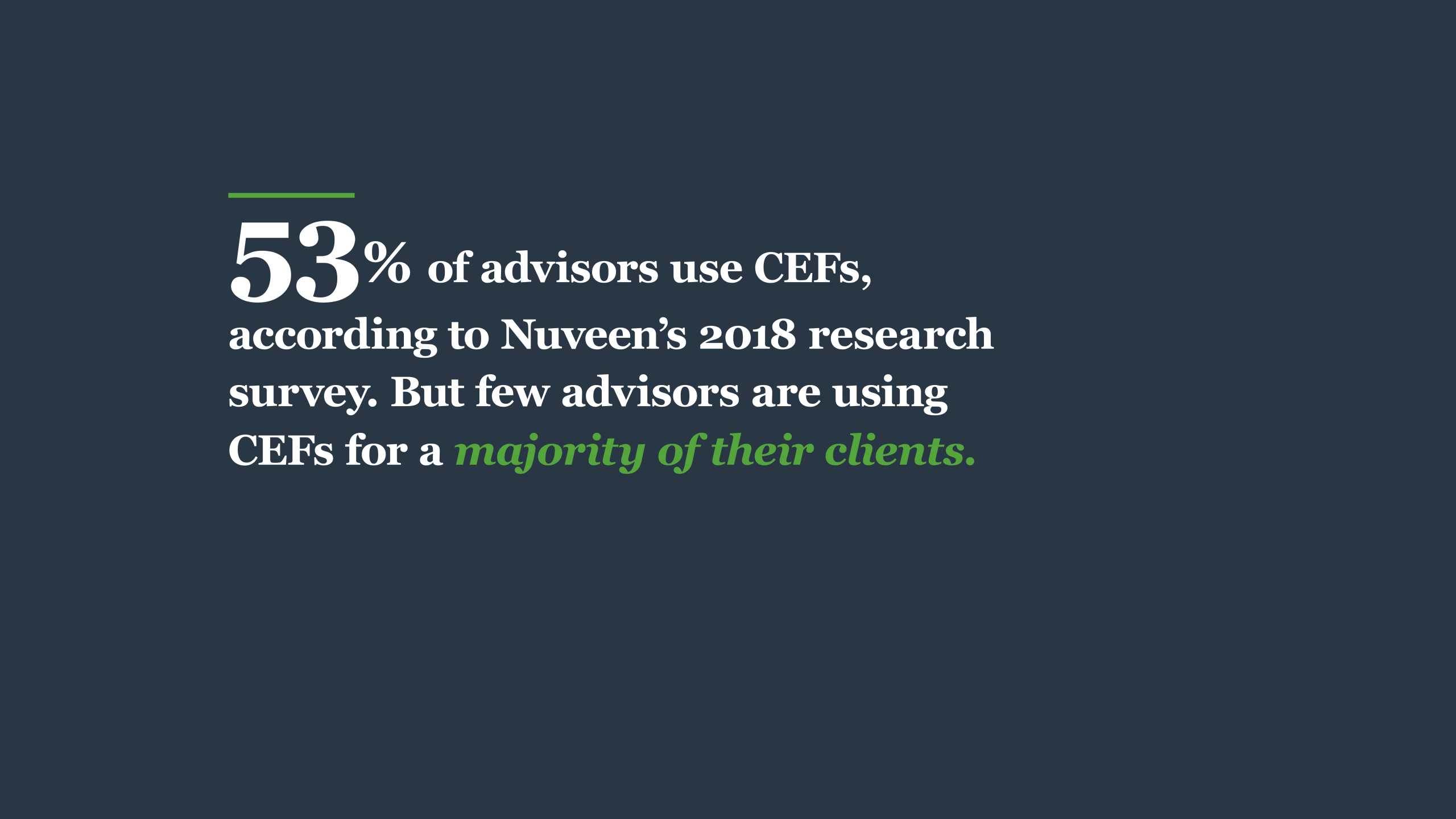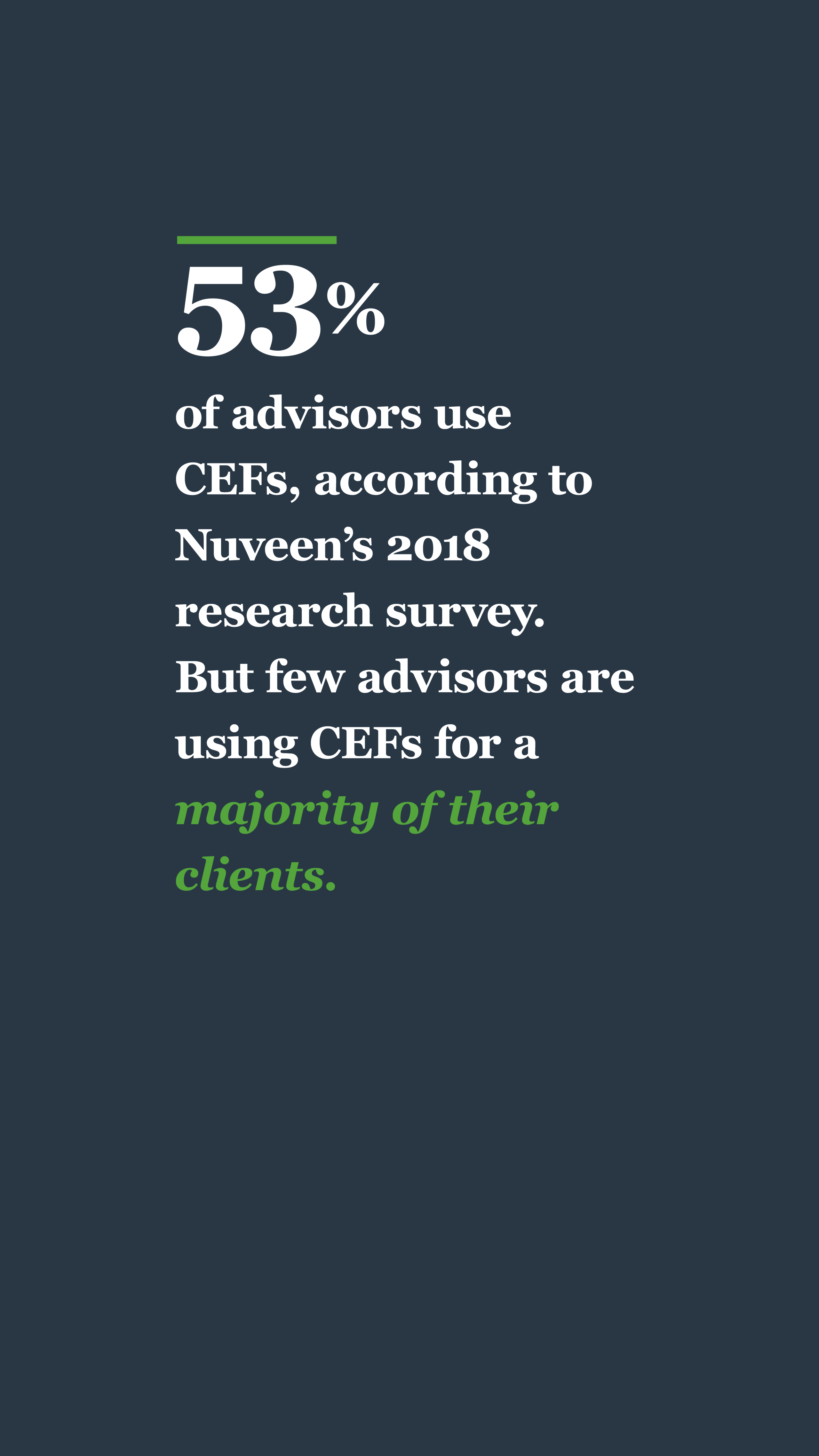 Advisors who use CEFs tend to have more loyal clients and more assets under management. According to Nuveen’s 2018 national research study of financial advisors’ use of CEFs, advisors who use CEFs are more than twice as likely as advisors who don’t use CEFs to retain clients for 15 years or more. While 24% of advisors not using CEFs have more than $100 million AUM, that percentage soars to 42% for those advisors using CEFs.